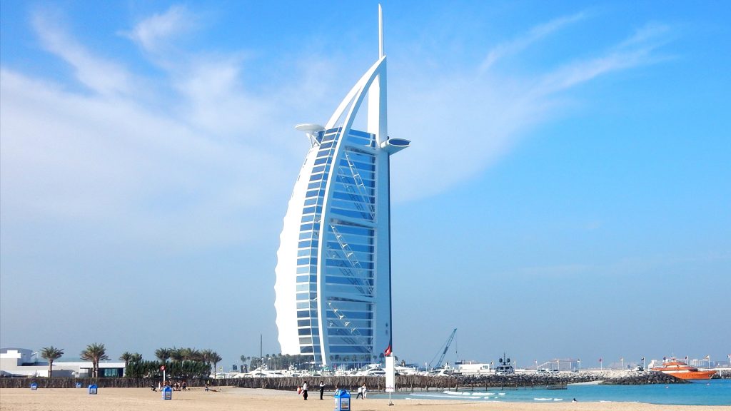 在迪拜王储的提议下,知名企业家al-maktoum投资兴建了美轮美奂的Burj Al Arab酒店。这座建筑由英国设计师汤姆·赖特(Tom Wright)设计,建在海滨的一个人工岛上,呈帆船形的塔状建筑。它共有56层,高达315.9米,正对着被认为是世界上最棒的酒店之一的Jumeirah Beach酒店。客房面积从170平方米到780平方米不等,最低价格也达到总统套房的900美元,而皇家套房的最高价格则高达18000美元。实际上,这是在淡季的最低价格,按照这个价格通常很难预订到房间。尽管酒店房价昂贵,但客源仍然踊跃,因为“不怕价格高,只怕货物不好”,这句商界名言在迪拜再次得到了证明。