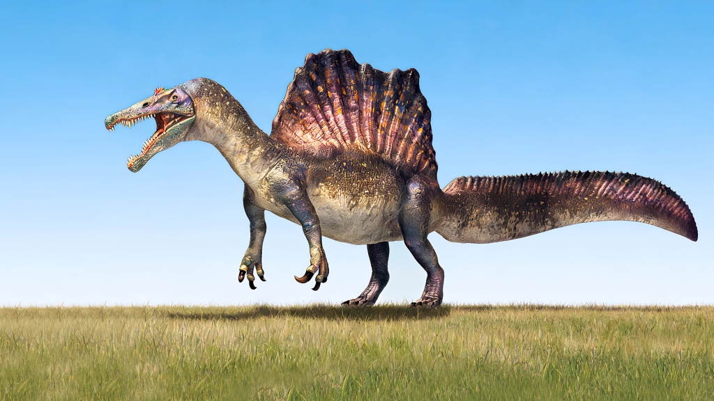 1. 巨型背帆特化:背部从颈部后方至尾部前端,脊椎神经棘异常发达,长度可达1.5-2米,远超其他恐龙,这些神经棘顶端可能连接着皮肤或结缔组织,形成巨大的背帆。背帆功能推测包括:体温调节(通过扩大表面积吸收阳光或散热)、视觉展示(求偶炫耀、物种识别)、水中平衡(辅助游泳时的身体稳定),是棘龙最具辨识度的特征。