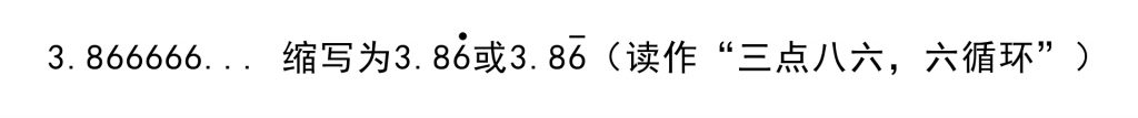 循环小数的缩写法是将第一个循环节以后的数字全部略去,而在第一个循环节首末两位上方各添一个小点。例如: